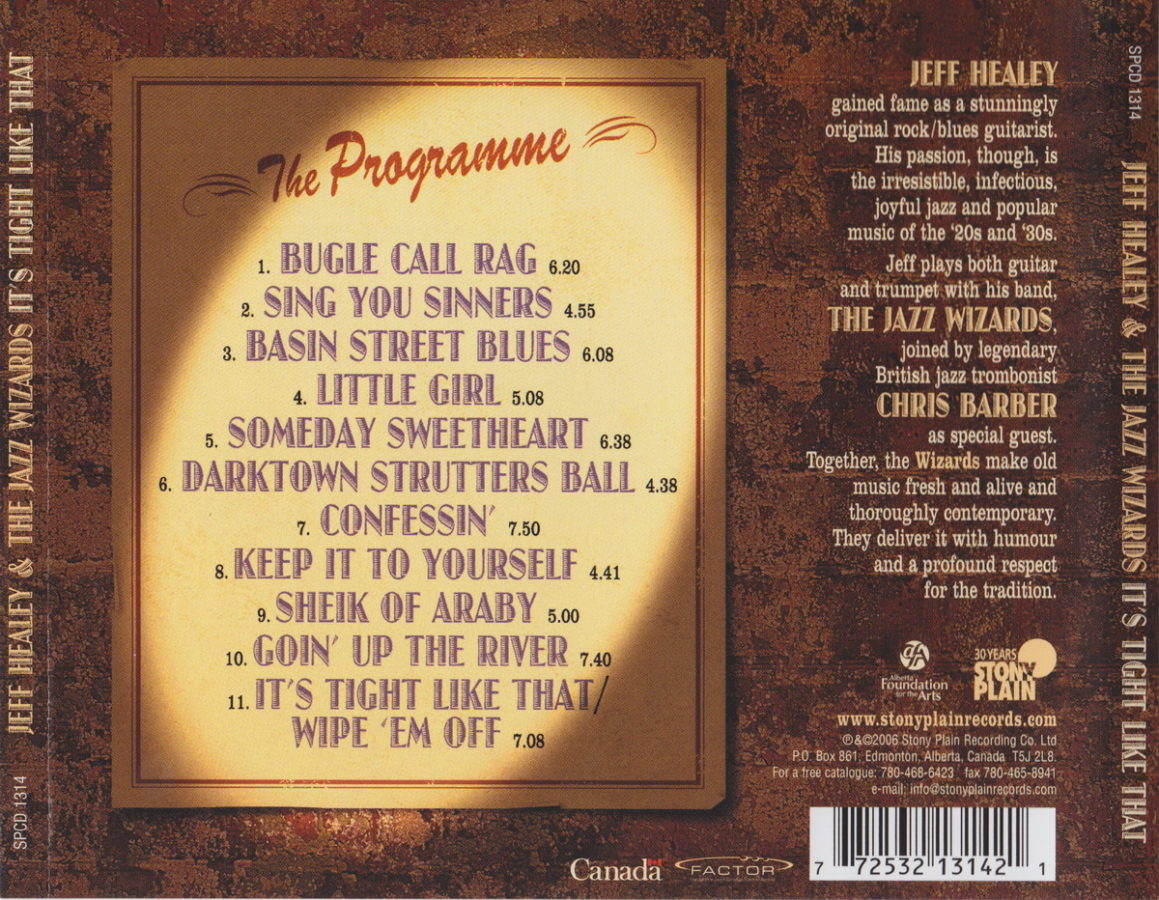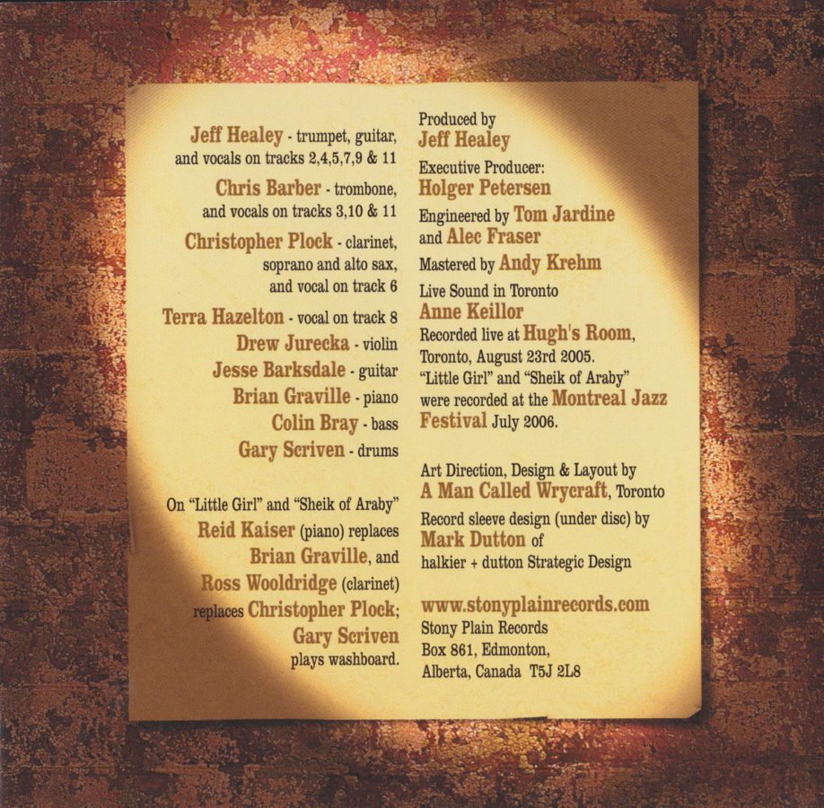 JESSE BARKSDALE Guitar, COLIN BRAY Bass, JEFF HEALEY Trumpet/Guitar/Vocal, DREW JURECKA Violin, REID KAISER Piano, ROSS WOLDRIDGE Clarinet, GARY SCRIVEN Washboard