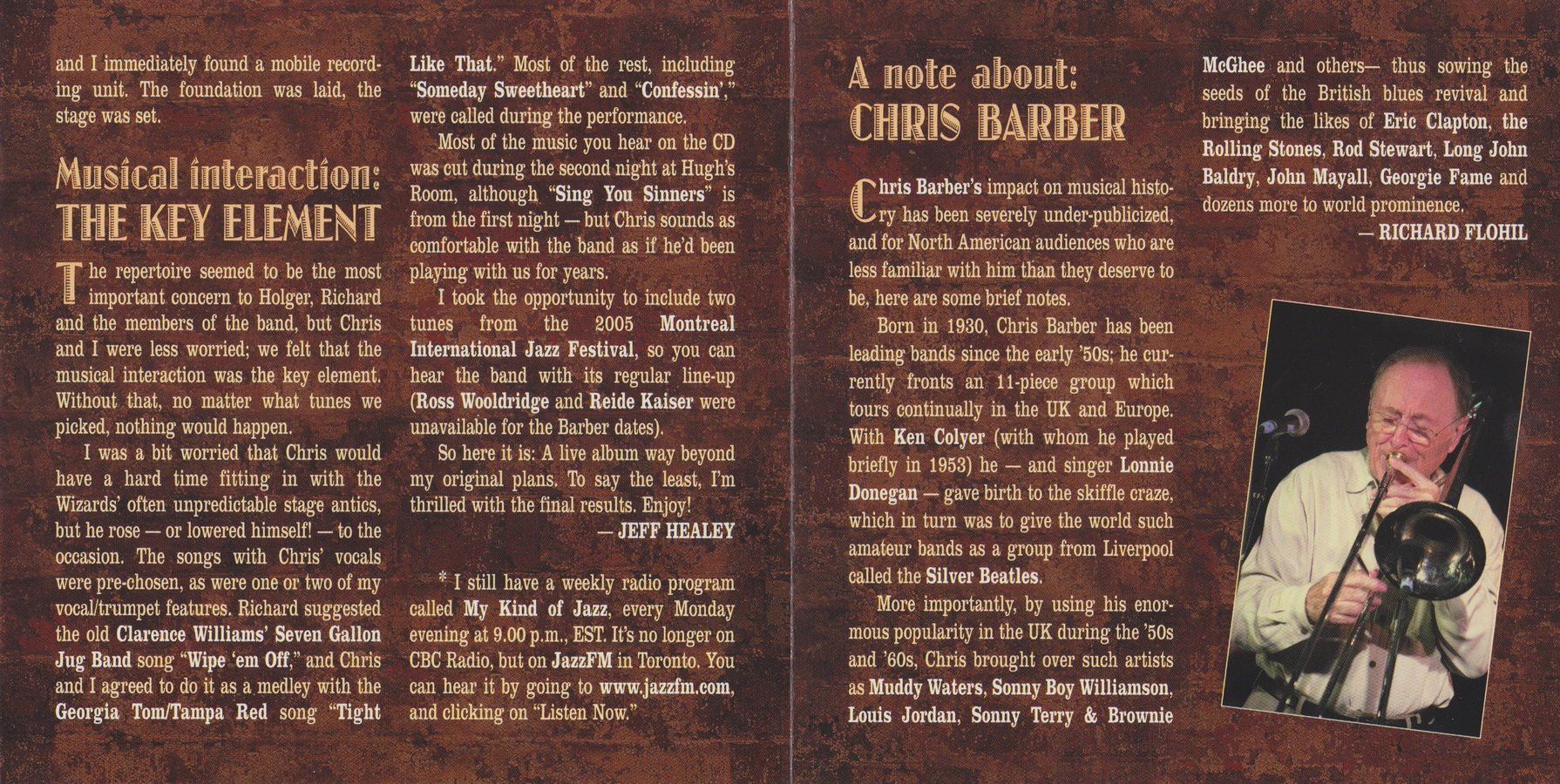 CHRIS BARBER Trombone/Vocal, JESSE BARKSDALE Guitar, COLIN BRAY Bass, BRIAN GRAVILLE Piano, JEFF HEALEY Trumpet/Guitar/Vocal, DREW JURECKA Violin, CHRISTOPHER PLOCK Saxophones, GARY SCRIVEN Drums